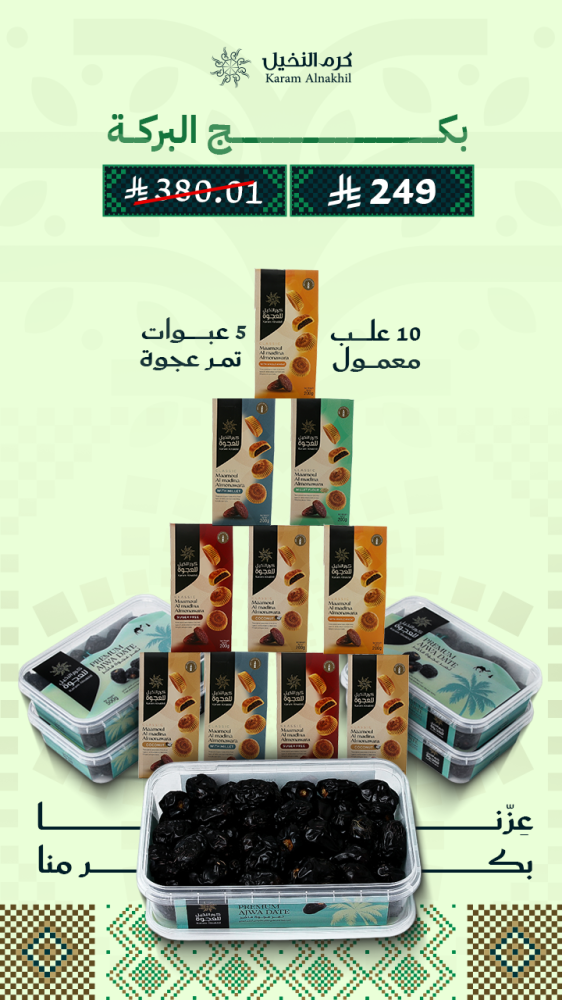 اجمع بين الطعم الأصيل والضيافة الراقية مع بكج البركة من كرم النخيل. تركيبة فاخرة تضم ألذ أنواع المعمول والعجوة وتزيد لحظاتك بركة.